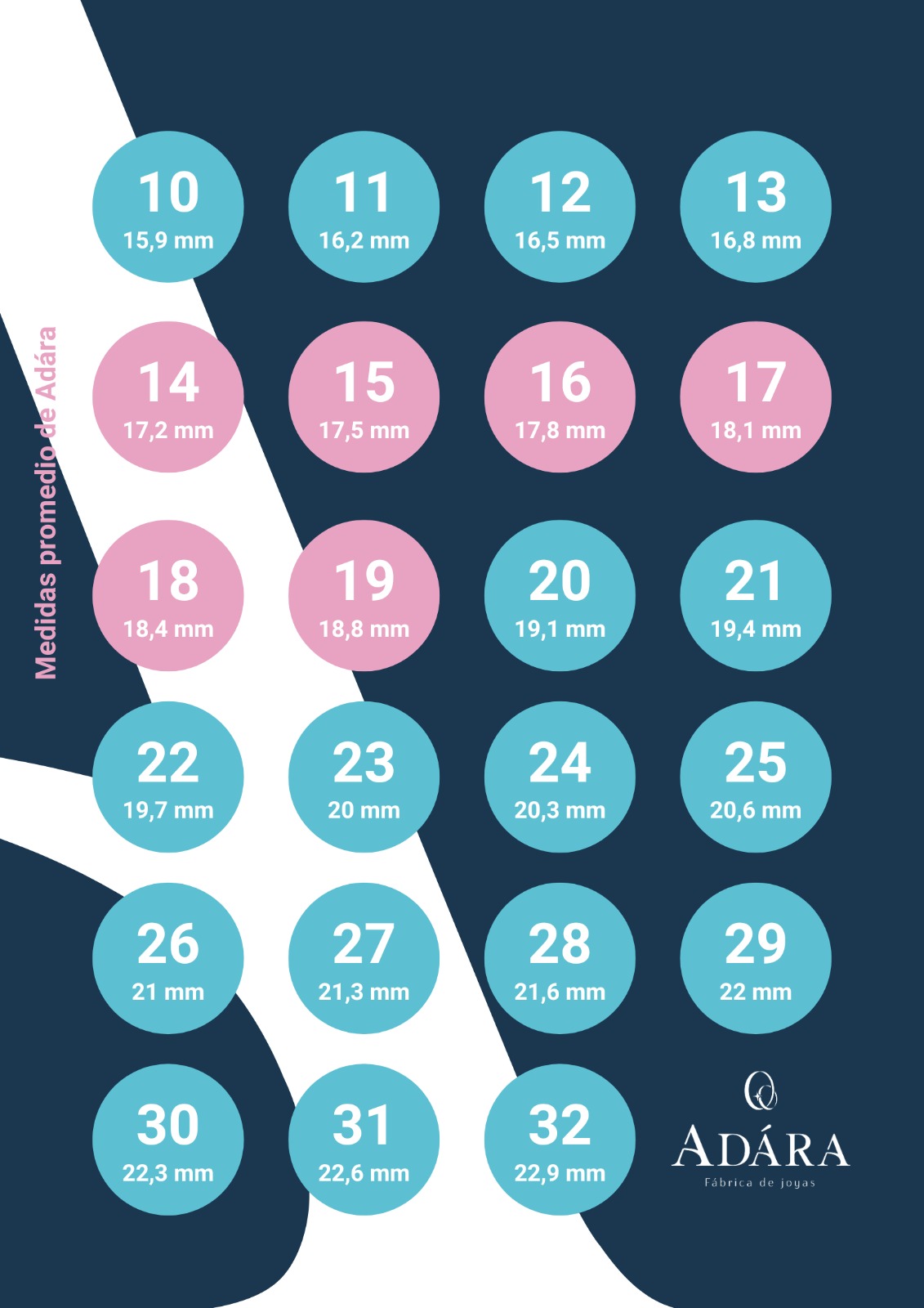 En ADÁRA FÁBRICA DE JOYAS trabajamos con la tabla europea de medidas (del n°10 al n°32). Según el tipo de joya, la elección de talle se hace de dos formas: